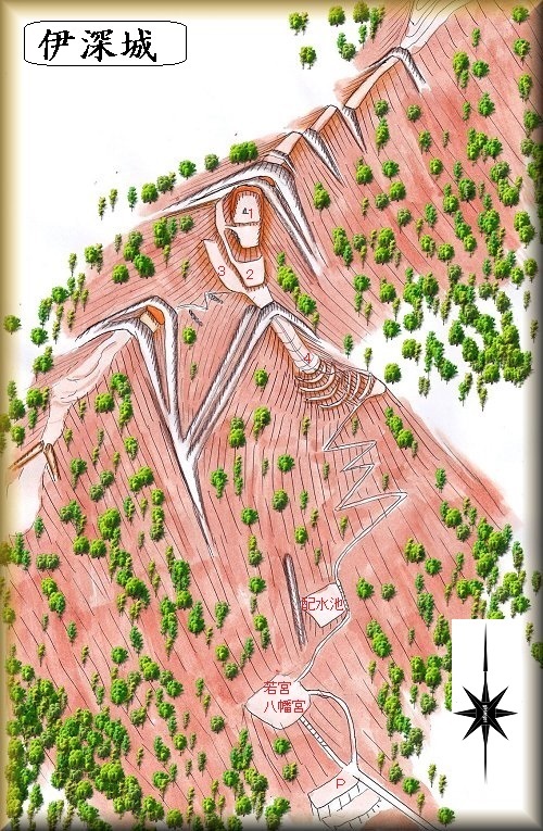 伊深城は、岡田の若宮八幡宮の背後にそびえている比高200mほどの山稜に築かれていた。この神社は地図にも掲載されているので、南側からこの神社を目指していけばよい。途中の分岐点に「←伊深城」と書かれた案内板が設置されている。