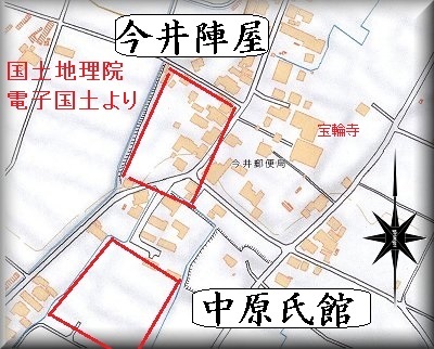 中原氏館は、宝輪寺の南西100mほどのところにあった。今井陣屋のすぐ南側の位置である。