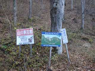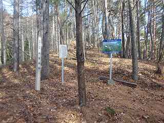 | 林道わきに建てられている案内板と石碑。 | 御屋敷平の内部。数段の削平地が見られる。 |