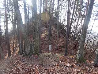 1郭背後には土塁が盛られており、その背後を覗き込んでみると、非常に深く鋭い堀切が掘られていた。この先は多重堀切となっている。これも小笠原氏関連の山城、というか信州の山城のセオリー通りの構造となっている。