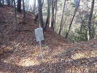 | 1郭内部。石碑が建てられているが、城址碑ではない。 | 1郭背後の二重堀切。大きい! 中央部に土塁が盛られている。 |