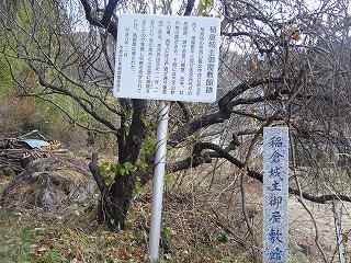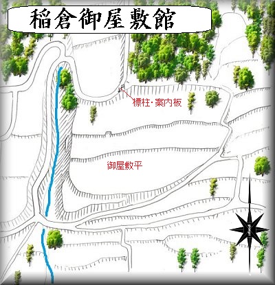 稲倉城主の居館としては、林道入口の集落脇にもその案内板が設置されているところがあったのだが、これは山の中腹に置かれた居館であった可能性がある。中腹にも居館を置くというのはちょっと珍しい配置である。もっとも、ただの畑の跡であるという可能性も無きにしも非ず、である。