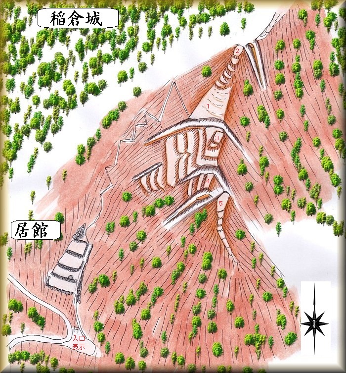 つまり、稲倉城のある山には2つのピークがあって、それを南北の防御に利用している。そのピークの間にある鞍部を城域内部として利用するという珍しい形状をしている山城なのであった。この形状は図面を見ているだけでは気が付かないものであった。鳥瞰図も北を上にして描いたのでそのピークの形状が分かりにくなってしまったのだが、側面部から見てみれば、一目瞭然の形状である。