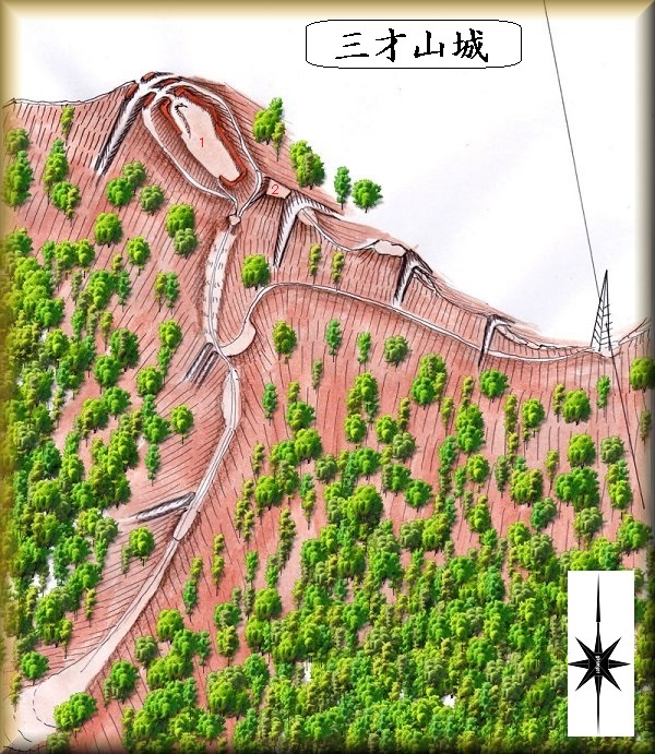 三才山砦は、薬師堂の東方にそびえる比高300mほどの山稜に築かれていた。