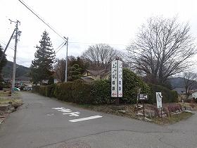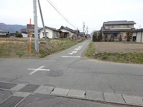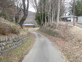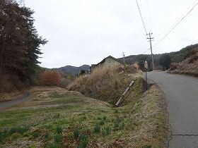 この道を進んだところに墓地があり、そこに空き地があるので、車はこの場所まで進入することが可能である。その先も道路は続いているが、鎖で輪留めをしているので歩いて行くしかない。