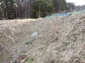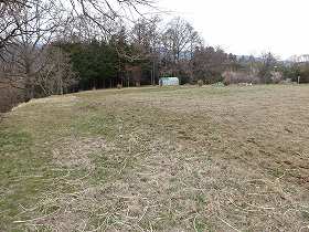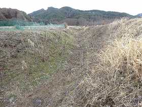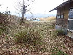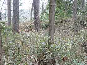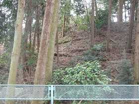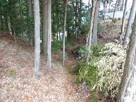| 地蔵尊の脇から児童遊園に降りていく道路は、堀切跡のように見える。 | 1郭北東側の堀跡。 |