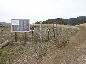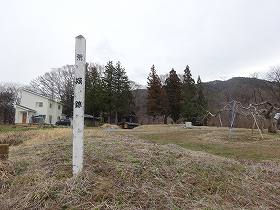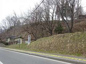 すると道路は東側の台地に次第に上がって行き、途中に左手上に「一の堀」と書かれた案内板が設置されている。さらに進んで行くと、案内板や城址標柱などもある。県指定の史跡になっているだけあってきれいに整備されているようだ。遠目に見ても、城内がヤブのない、見通しの良い平場となっているのが見えている。