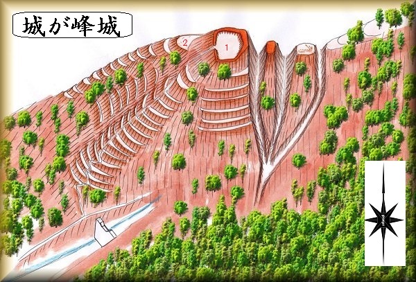 | 城の峰城の歴史について、正確なところは不明である。しかし、この辺りに南北にいくつもの城館が築かれていることから、上の平城から続くつなぎの城の1つであったと考えるべきものであろう。 1郭の規模そのものは小さいが、上記の通り、3重堀切や多数の帯曲輪など、かなりの勢力があった者でなければ築くことのできない山城だといってよい。武田勢に対して、上の平城の前面を守る山城の1つとして築かれたものであったと推測されるものである。 地元の伝承では「城主は二蔵といって、後に西箕輪の羽広に退散していった」というらしい。この二蔵という人物が、この城を任されていた人物であったものだろうか。 |