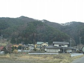 | 西方から遠望する城ヶ峰。ここからの比高は120mほど。 | 城ヶ峰城の入口。この先の墓地の辺りまで車で入ることができる。 |
