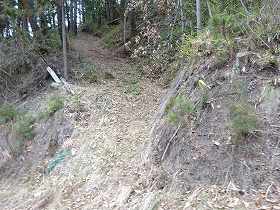 | そこから車を降りて歩いて行くと、砂防ダムの手前で左に登って行く道が見えている。こちらに登って行く。 | これを進んで行くと、すぐに帯曲輪群の所に出る。後は帯曲輪の切岸をいくつも乗り越えて1郭を目指す。 |