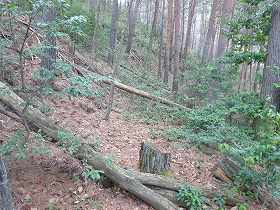 | さらにその先の3本目の堀切によって背後の尾根との間を分断している。 | 再び1本目の堀切の所まで戻ってきた。 |