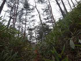最初北西の山麓あたりから取り付こうとしたのだが、ヤブがひどくてとても登れたものではなかった。そこで南西側に回り込んで行くと、谷合に入っていけそうな道が見えている。とりあえずこれを進んでみることにした。
