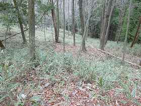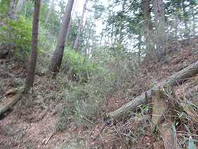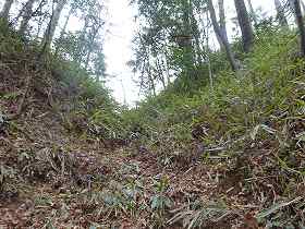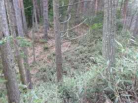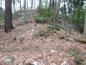 しかし、よくよく考えてみると、これらは道ではなく、城の帯曲輪だったようだ。この城には、かなり山麓に近い部分から、多数の帯曲輪が造成されているのである。つまり、登り始めてすぐに遺構に接することができるというわけである。