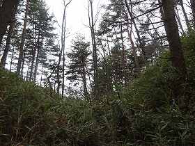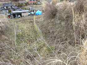 | 1郭内部はヤブがひどいが、背後に高い土塁があるのが見えている。 | 1郭背後の堀切。深さ10m近くある。しかし、ヤブだなあ・・・。 |