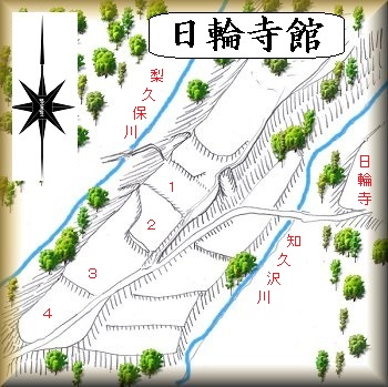 日輪寺の西側の比高10mほどの細長い台地が日輪寺館の跡であるという。上の平城のすぐ北側である。