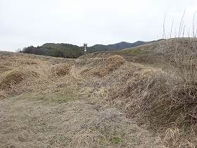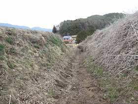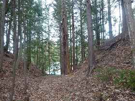 | 1郭南側の1の堀。巨大な堀切である。 | 反対側の土塁の上に建てられた神社。 |