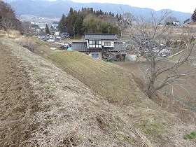 この台地上に数段の平場があってこれが城館を構成していると思われるのだが、現在、内部は数軒の民家の敷地となっていて、探索しづらい。また、近くに車を停められるスペースもなかったので、細部まで観察することはできなかった。