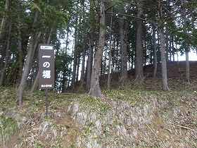 1郭の西側は旧状の通りの深い堀切がある。深さもさることながら、幅が10mほどもある巨大な箱堀形状のものである。この東側には土塁状に高くなっている個所があって、そこに神社が祭られているが、その先は自然の傾斜地形となっており、実質的に城内はこの一の堀の所までである。