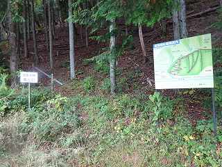 | 東方から遠望する宮田城。中央自動車道の向こう側にそびえる比高120mほどの山稜である。 | 入口にある案内板。ここから遊歩道が付けられている。 |