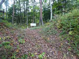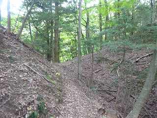 この遊歩道を登って行くと、途中に竪堀のところを何度か経由するようになっている。この竪堀はけっこう上の方から下方まで長く延びているもので、これだけの竪堀を掘るというのも大変な大工事であったろう。