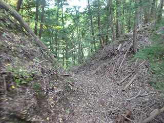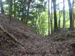 1郭の北側の土塁が特に高くなっていて、その先が大堀切になっている。長野の城のセオリー通りの構造で、この背後には堀切が何重にもなっている。このうち大堀切と呼べるほどのものは前と後の2本であるが、その間にも堀切を入れ、さらにはその間の土塁状部分にも浅い溝を入れている。こうしてみると三重堀切であるが、その間にも溝を入れており、かなり複雑な構えである。