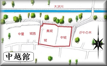 | 中越館北側の城塁。 | 大沢からから見た中越館。 |