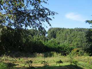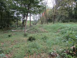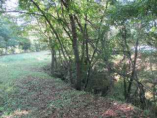 | 北側の堀跡。 | 北東側の城塁。ヤブがなければきちんと形成されているのが分かるのになあ。 |