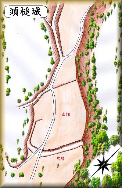 頭t槌城は、面替の集落の背後にそびえる比高20mほどの台地に築かれていた。