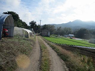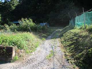 | 北側の堀切跡は道路となっている。民家の脇の坂道を登って行く。 | 登って行った先が1郭で、畑となっている。 |