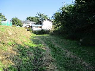 台地に登ったところには数軒のお宅があり、その先のネック部を進んで行った所、道が二又に分かれている場所に到達する。手持ちの図面を見ると、ここが城の入口であったらしい。ただし現状では堀は認められない。