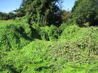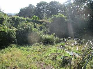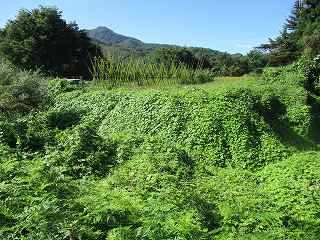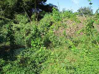 | 1郭と2郭との間の堀。ヤブでよく分からない。 | 東側の堀跡。 |