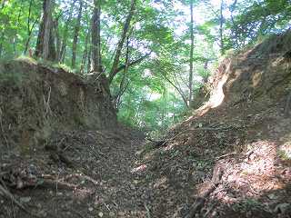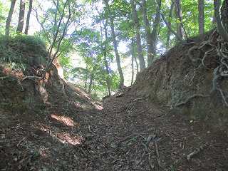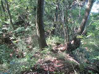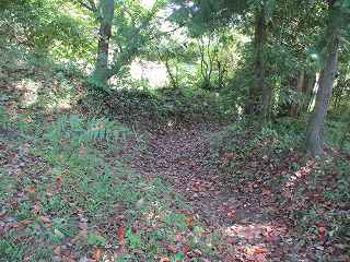 この尾根を南側に進んで行くと、大きな堀切状の地形が見えてきた。ただし、この内部に山道が通っているので、堀切と言うよりは山道のために切り通したものと見る方が当たっていそうである。