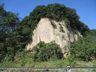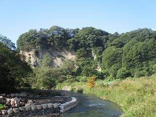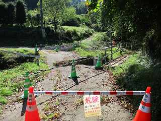| 西側から遠望する向城。この断崖絶壁の上が城址となっている。 | 向城に向かう道の入口の橋が崩落していた。ここに車を置いて歩いて行く。 |