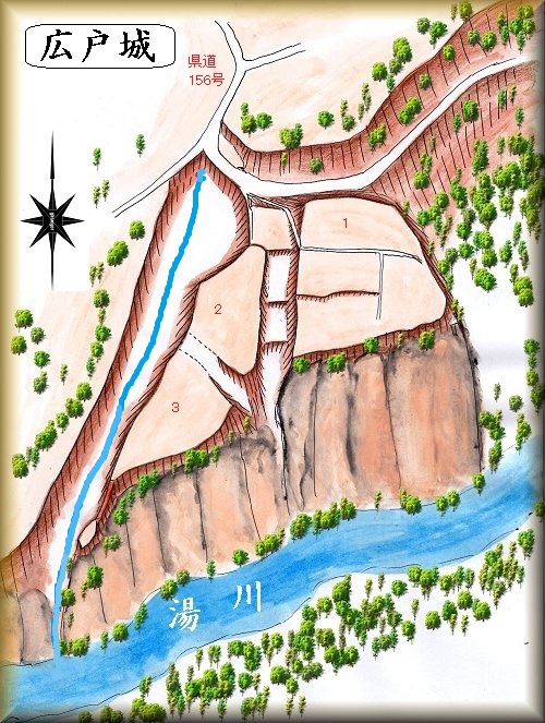 広戸城は、広戸集落の南端、県道156号線が大きくカーブしている地点の南側に築かれていた。集落の方向からは分からないのが、城の南端は湯川に削られた断崖絶壁となっている。そのことは城内を散策している時には気が付かなかった。後で、外側に回り込んでみて、城の周囲の土手が、ものすごい断崖絶壁となっているのに驚かされた。