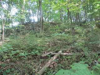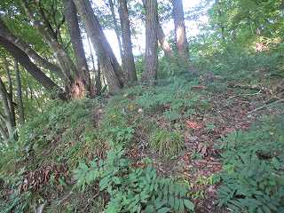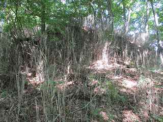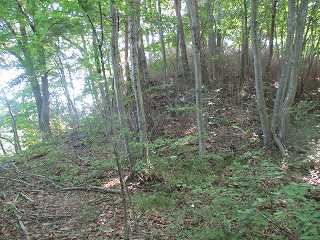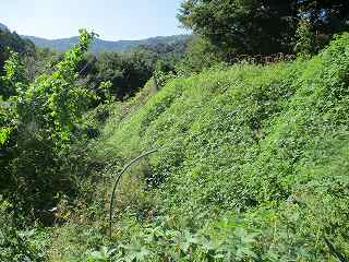 | 南側から見る1郭城塁と腰曲輪。 | その南側の尾根には微妙な窪みがあるが、堀切とは言えない。 |