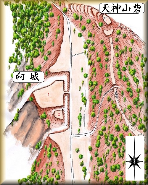 向城の東側背後の山稜が天神山砦で、向城の詰の城と言った位置にある。