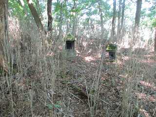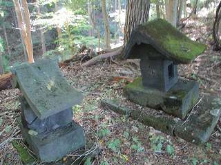 この切通しの先にも浅い堀切状の地形があり(実際には堀切ではないと思うが)、その間には2基の祠が祭られていた。