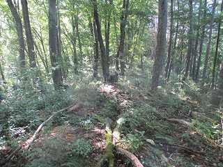 | ここから南側に向かって尾根を進んて行く。 | 南側にある切通し。本格的な堀切に見えるが、実態は切通しの通路であったろう。 |