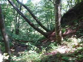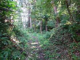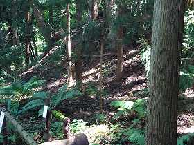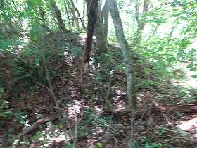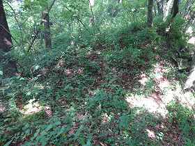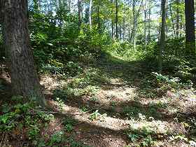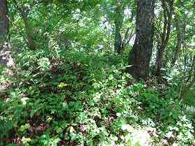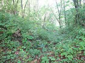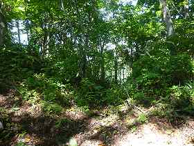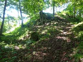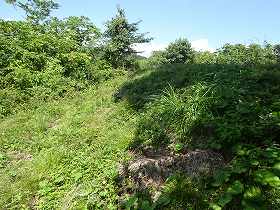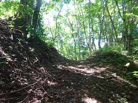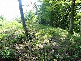 | 1郭にある土壇。 | 一見すると堀切のように見えるのだが、これは単なる崩落地形のようである。 |