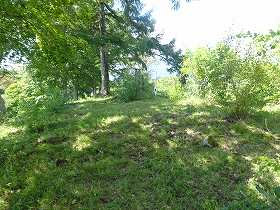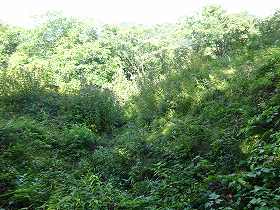 | 2郭手前の堀切。城内で最大のものであるが、ヤブがひどくてよく分からない。 | 2郭内部。 |