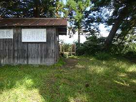 | 東側下の峠の脇に案内板と駐車場とがある。ここからの比高は100mほど。 | 郭内部にある東屋。 |