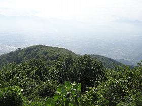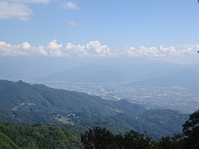 参道を進んでいく途中には展望台もある。ここも標高は1200mを越えており、かなりの眺望である。その先には神社のある1郭の城塁が見えている。斜面の側面には竪堀状の地形があり、あるいは、ここに堀切が存在していたのかもしれない。