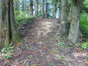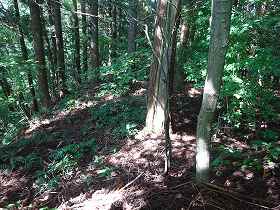 | 登り始めると城塁状の部分があるが、城址はさらに進んだ奥の山稜である。 | 1郭と3郭との間の下の鞍部から、1郭方向を見たところ。 |
