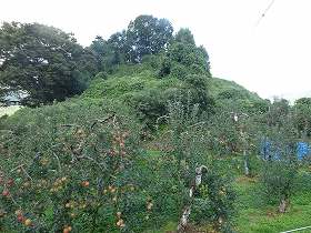 県道との間はちょっとした鞍部になっており、そこはリンゴ畑となっている。また入口の脇には筆塚がある。