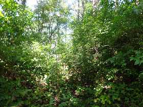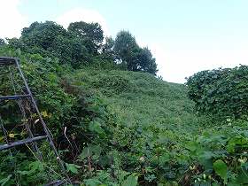 | 道路脇から見るごてんじょう砦。2段構造になっているのがよく分かる。 | 登り口の辺り。すぐそこに見えるのだが、夏場ではヤブがひどすぎて近づけない。 |