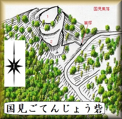国見ごてんじょう砦は、国見集落の南側にそびえている、集落からの比高30mほどのピーク部に築かれていた。県道401号線が大きく湾曲する地点で、小田切神社の南西200mほどの位置に当たる。