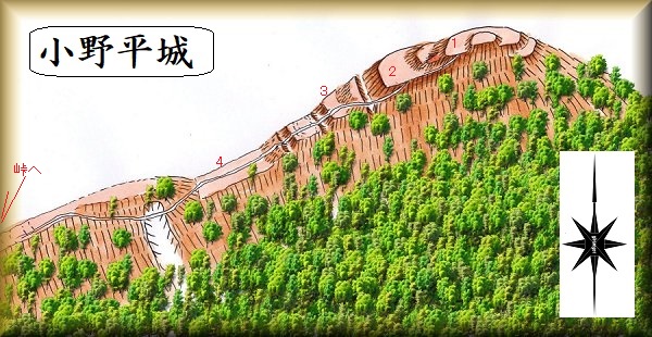 小野平城は、上記の朝日城の下の駐車場から、朝日城と反対側の東側の山稜に進んでいったところにある。だから、朝日城を訪れた後、車はそのままにして、今度は東側の山稜内部に入り込んでいけばよい。