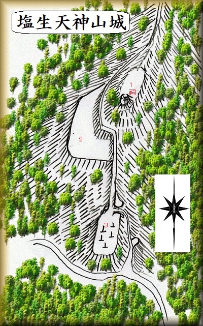 塩生の天神山城は、仏工伝の北西にそびえている比高70mの山稜にあった。山頂には天神社が祭られている。