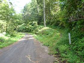 | 林道脇にある神社入口(右側)。この脇に駐車場があるのだが、頑張れは車でもっと上まで行けそうである。 | 途中の鞍部にある堀切状地形。 |
