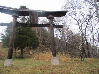 すると、山稜の南端に差し掛かったところで、真っすぐ山稜方向に登って行く道が分岐するところに出る。入口に鳥居が建てられており、この先に神社があることを示している。